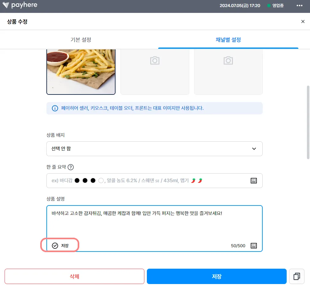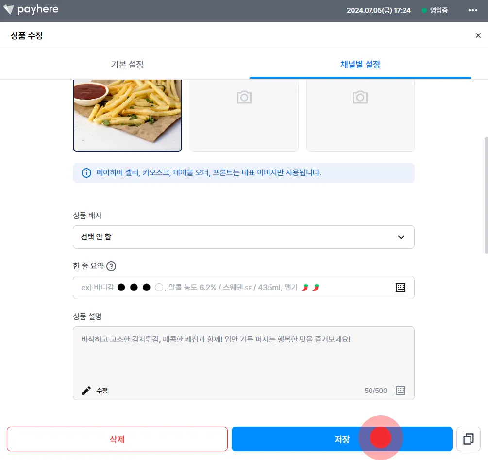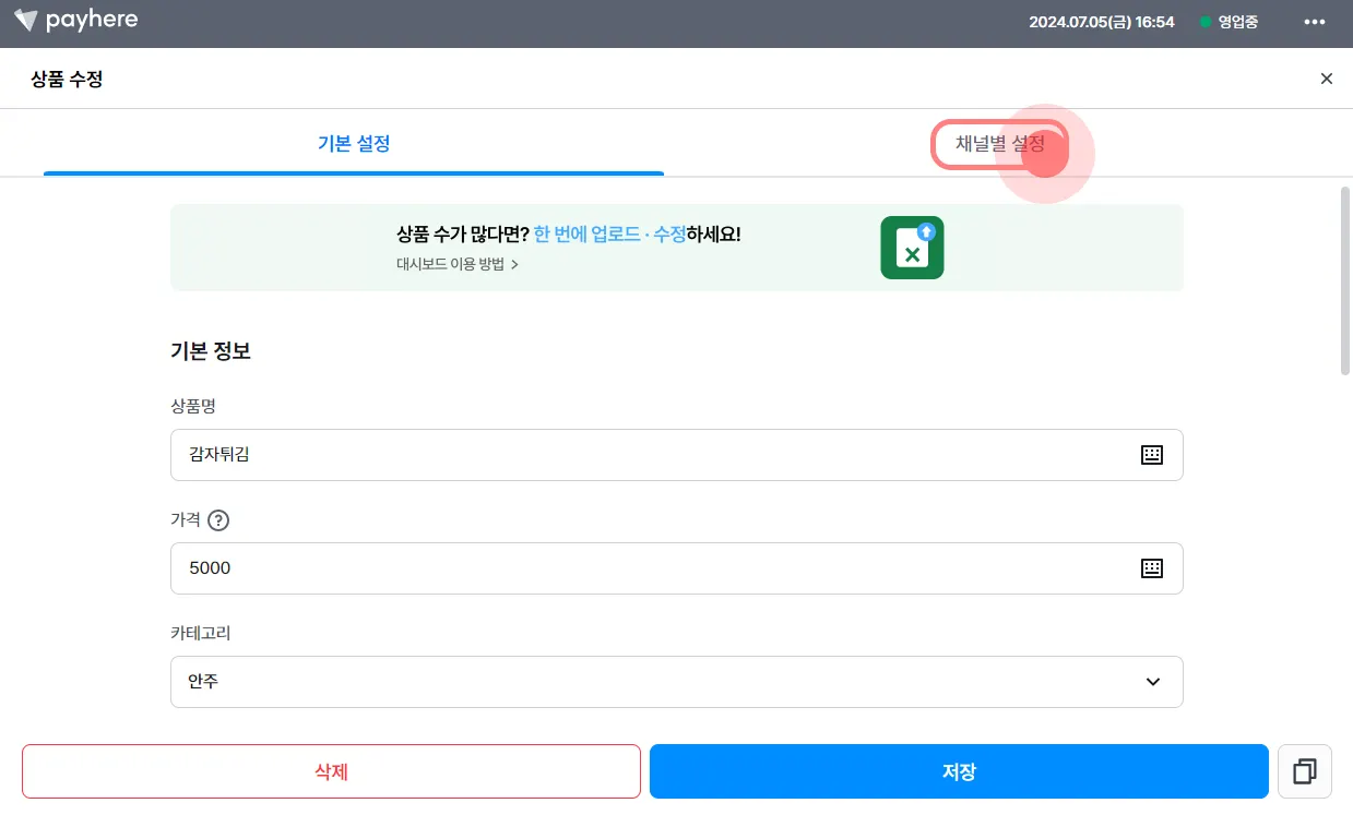 상품 수정 화면에서 [채널별 설정] 탭을 눌러주세요.