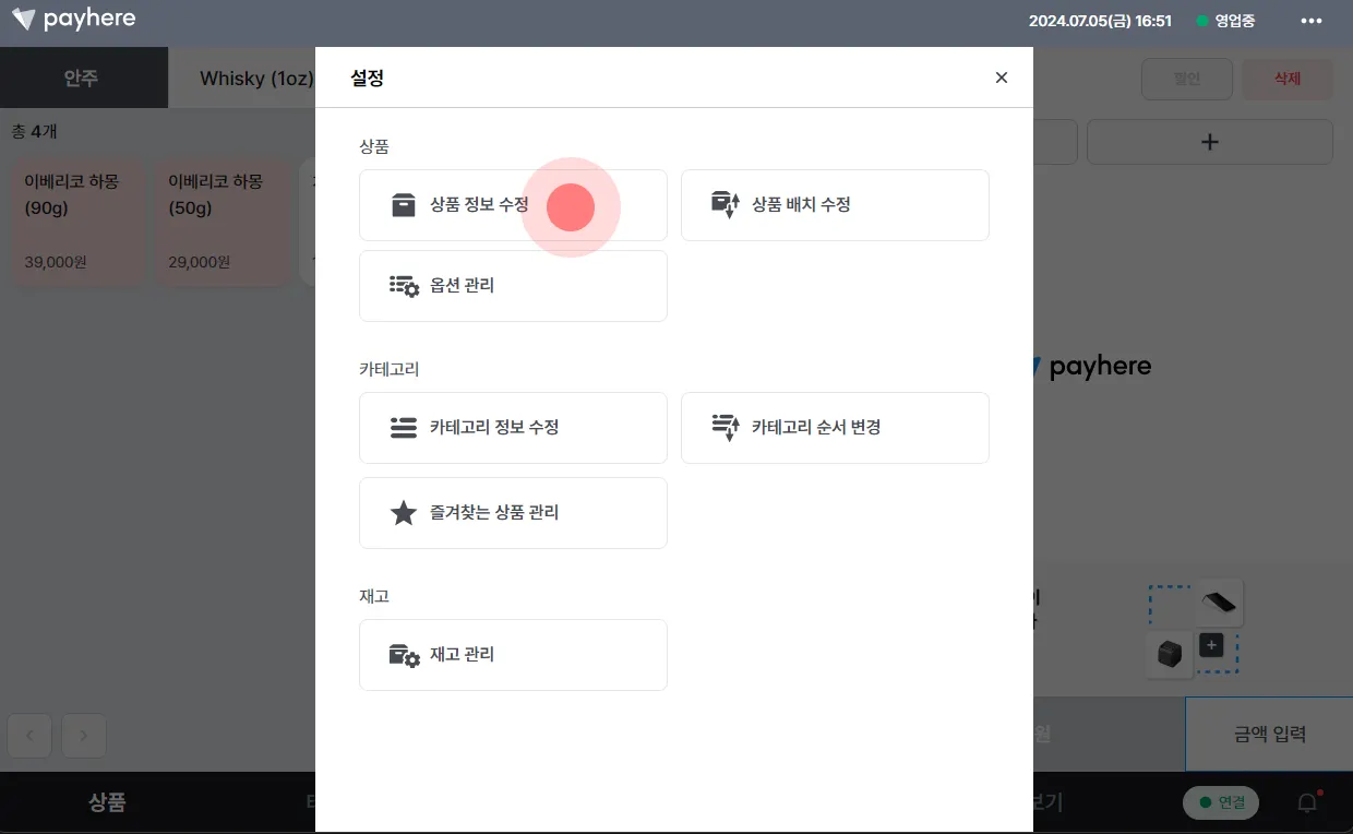 ] 버튼 → [상품 정보 수정] → [상품 선택]