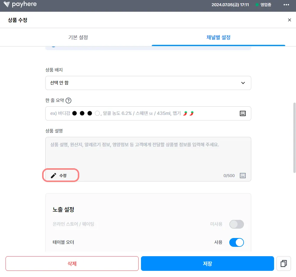 [상품 설명] 칸의 [수정] 버튼을 누른 뒤, 내용을 작성해 주세요.