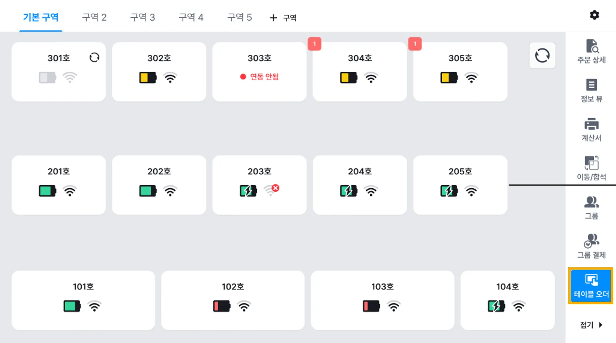 모든 테이블 오더의 배터리와 와이파이 상태를 확인할 수 있습니다.