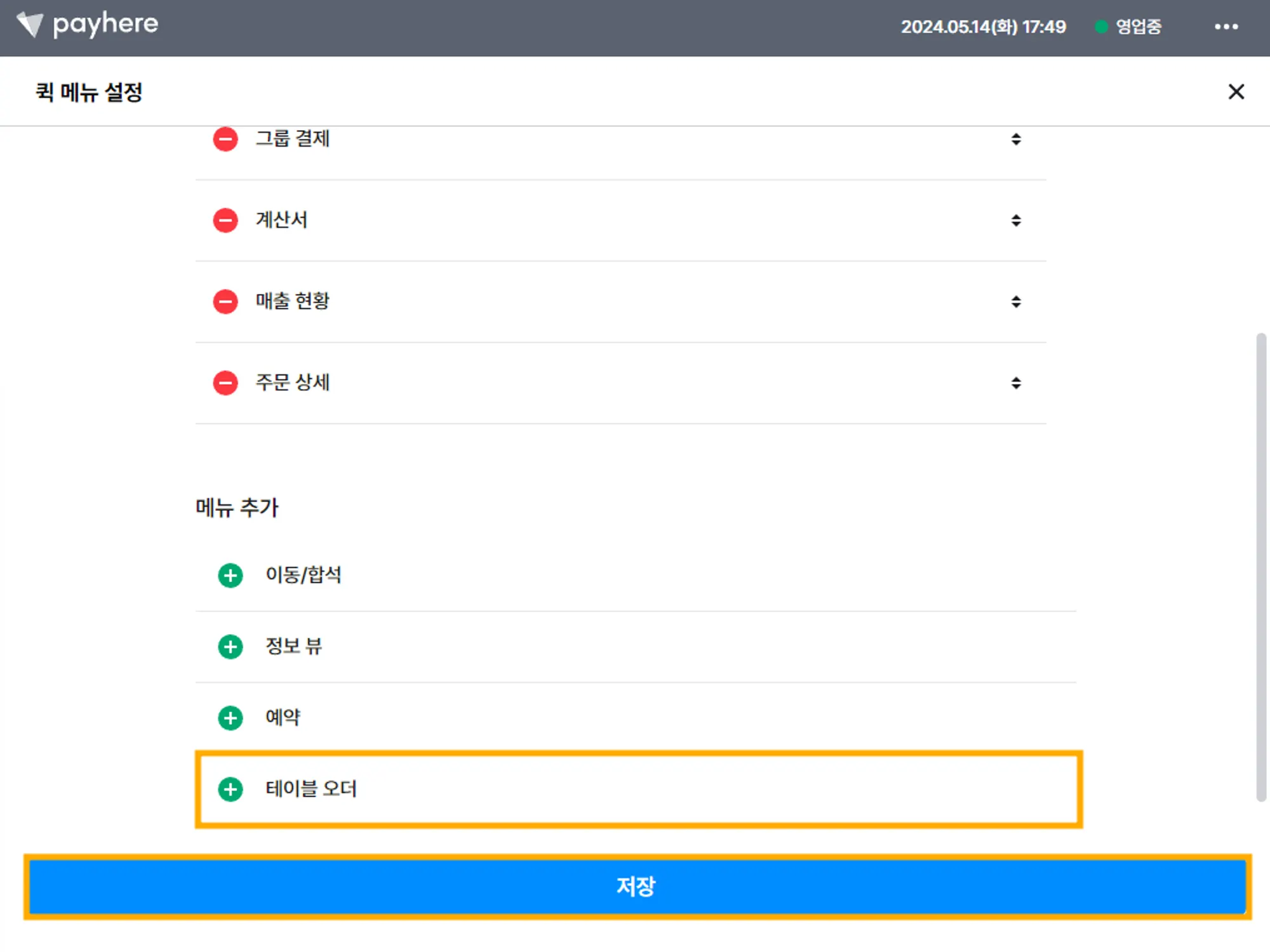 [퀵 메뉴 설정] 화면에서 [테이블 오더] 메뉴를 추가한 후 저장해 주세요.