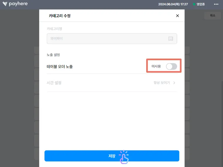 테이블 오더 노출 버튼을 눌러 미사용으로 수정 후 저장해 주세요.