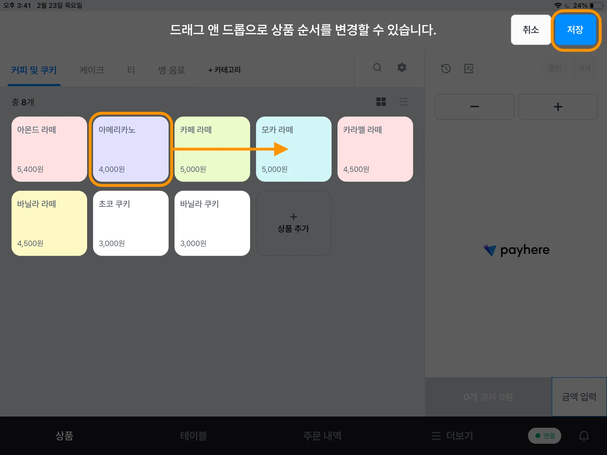이동하고 싶은 상품명을 꾹 누른 채로 끌어서 이동시키고 저장을 눌러주세요