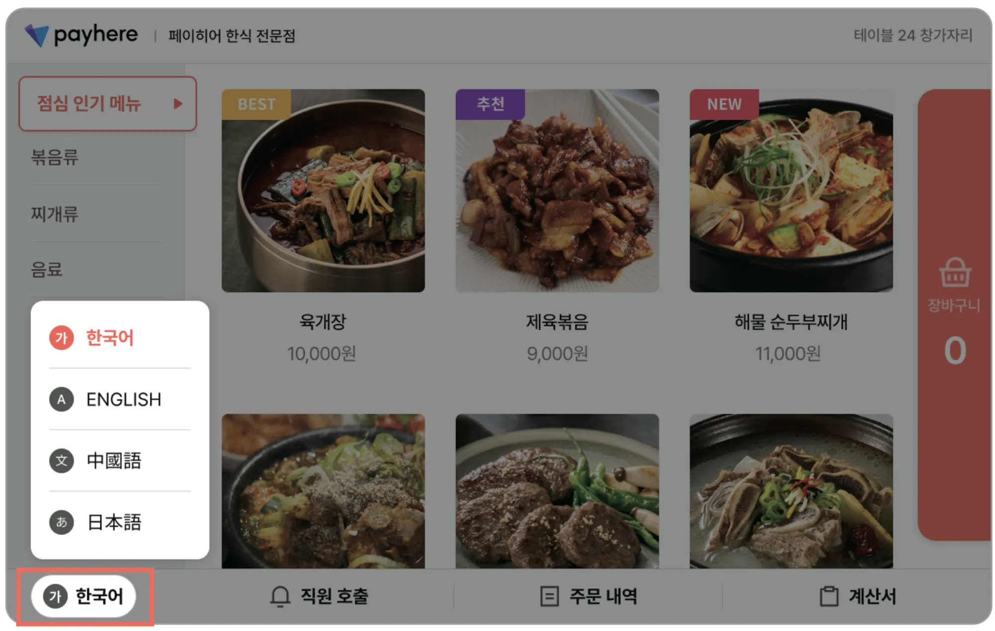 테이블 오더 하단의 [언어] 버튼을 통해 영어, 중국어, 일본어 중 하나를 선택할 수 있습니다.