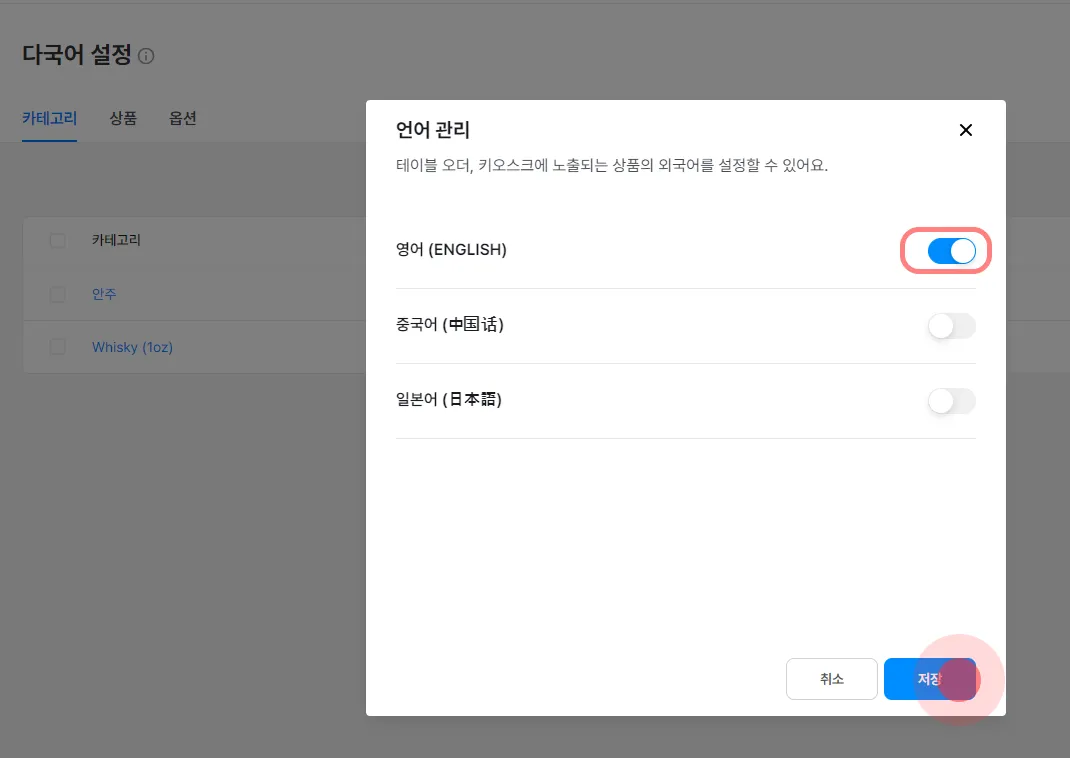 테이블 오더에서 사용할 언어를 활성화하고 저장해 주세요.