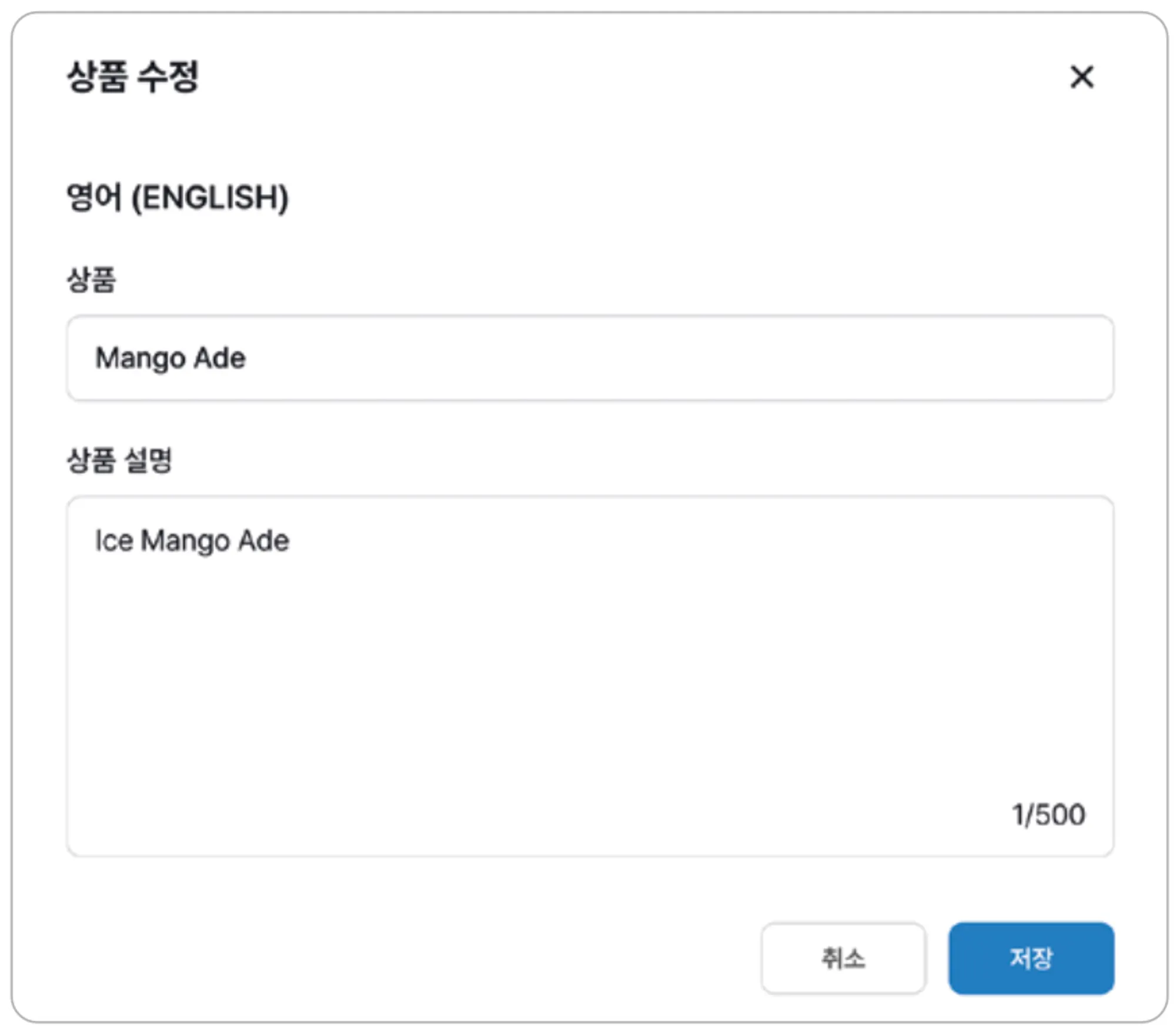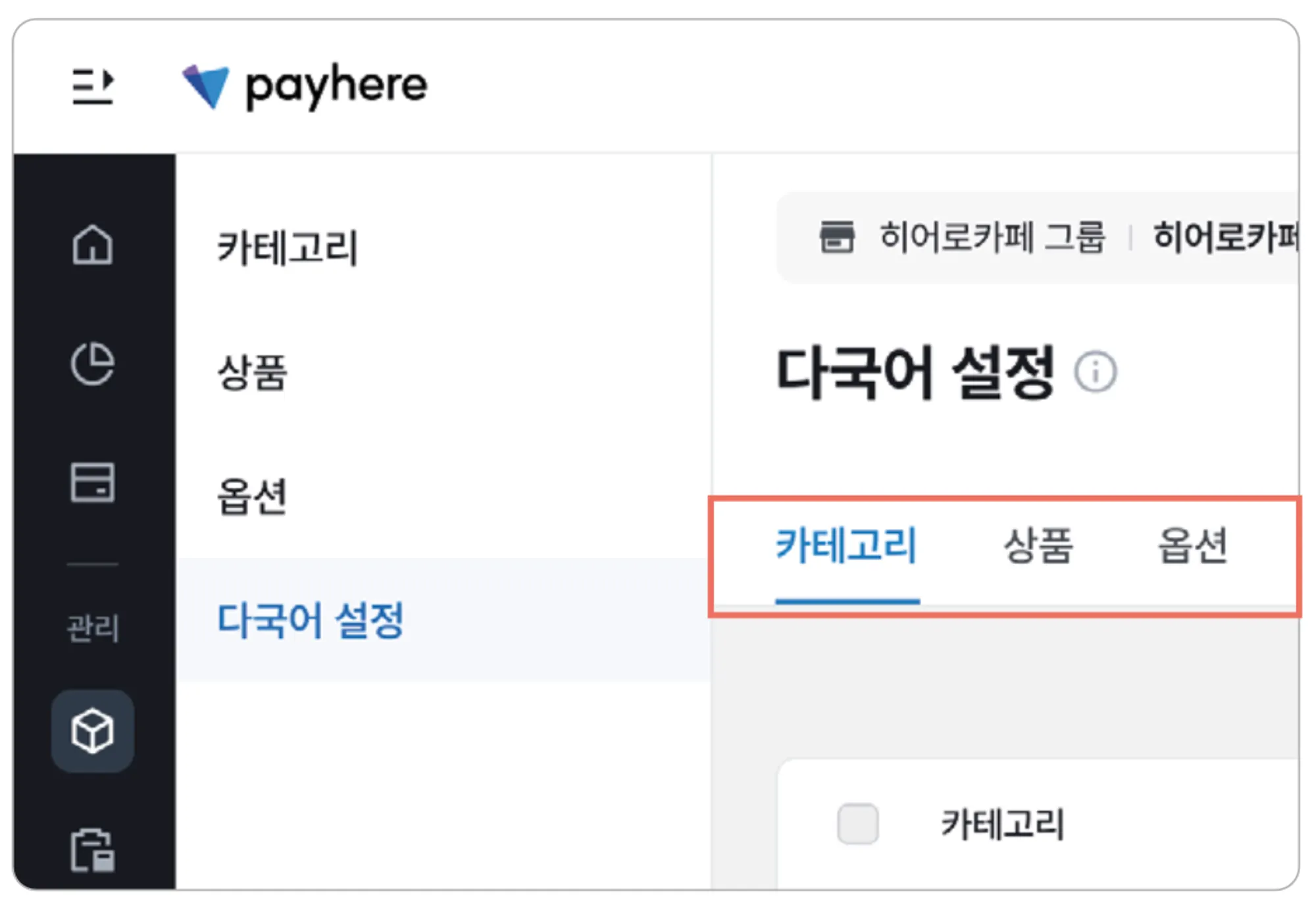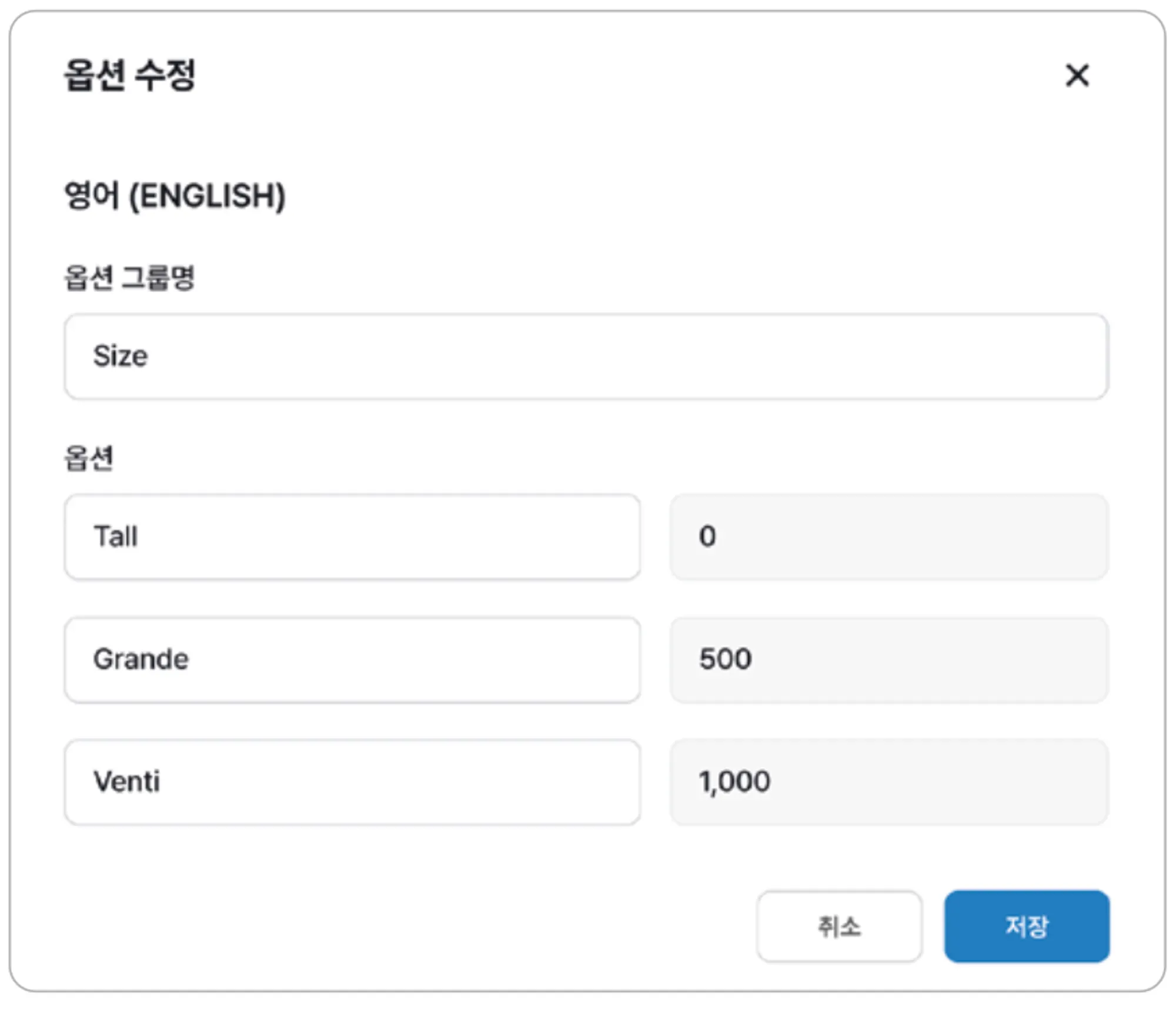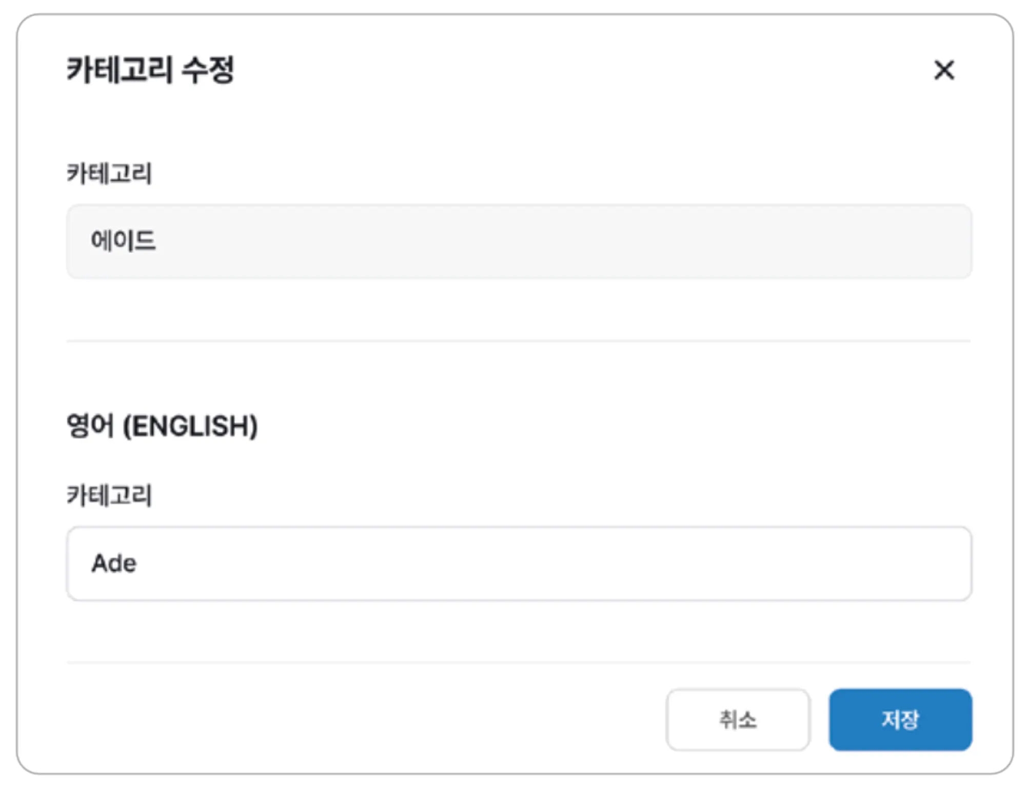 각 페이지에서 카테고리 / 상품 / 옵션의 다국어 설정을 진행할 수 있습니다.